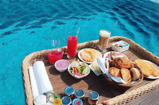 如果追求私密可以选豪华水上泳池别墅,它的位置位于栈道尽头,直面日出,欣赏无敌海景的同时也不用担心和其他宾客“面对面”,私人泳池够大,看完日出再吃漂浮早餐非常浪漫~