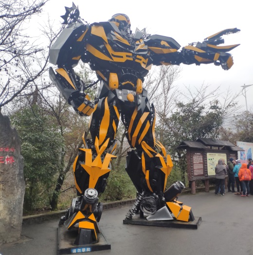 第二天,我们的目的地是天生三桥,一想到是去天生三桥游玩,大家就更激动了,因为《变形金刚4》就是在这里取的景,张艺谋导演的大片《满城尽带黄金甲》就是在此地拍摄的。吃过早饭后,早上九点多就从酒店出发了,刚一下车,直入眼帘的就是大黄蜂机器人的模型了,非常高大威武,大家都争先恐后的去拍照留念。