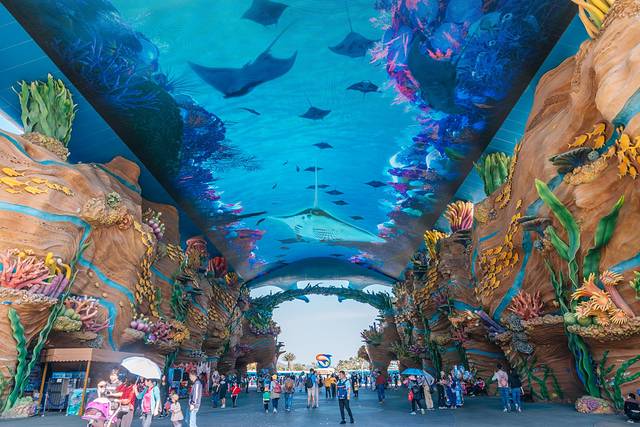 通过这条长长的“海底隧道”——海洋大街,就正式入园啦,整个隧道的穹顶是LED巨幕,晚上的时候很梦幻,色彩斑斓的海洋动物和鱼群从头上游过,两旁是立体珊瑚和礁石场景,细节设计上也是蛮用心的。