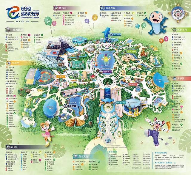 八大街区:海洋大街、 海豚湾 、雨林飞翔、海洋奇观、极地探险、英雄岛、海 象山 、横琴海