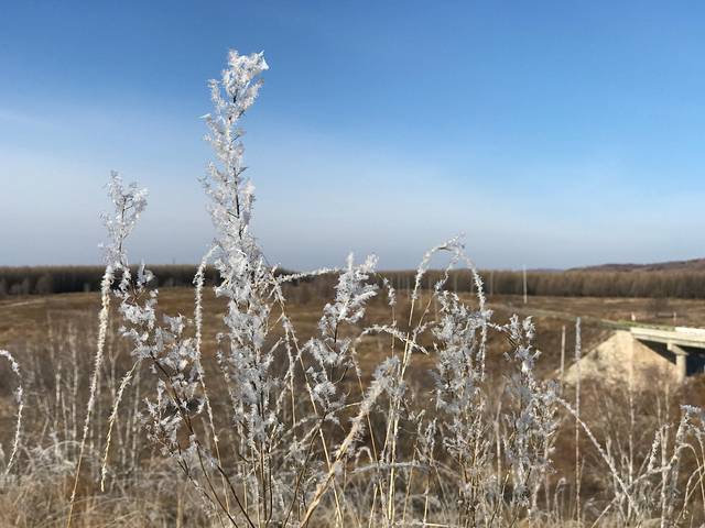 这个季节正好是树枯草黄的季节,早上路边的草和树都挂上了一层冰霜,很好看,中午就都化了。