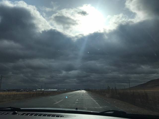远处的云都变成红色的了。后来看新闻才知道之前一天路过的新巴尔虎旗已经下暴雪了。