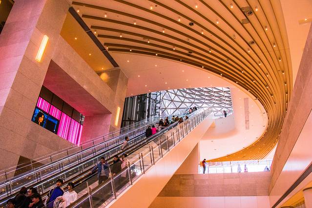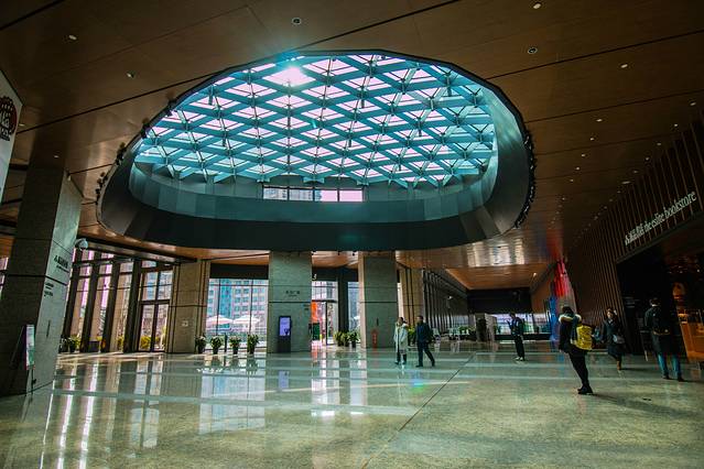 三是看建筑的设计感。一进门,便可看到那条一层层步行的楼梯,是绝对的网红拍照地,不管什么时候去,都有人在这里拍照。