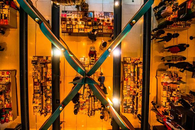 踏着阶梯而上,走到最上面,即诚品书店的三楼,屋顶正中间是镂空的,遇到晴天,阳光透过玻璃洒落下来,斑驳的光影,走在下面,仿佛这是我的舞台,我就是全场焦点,很享受在空间里的美妙感。