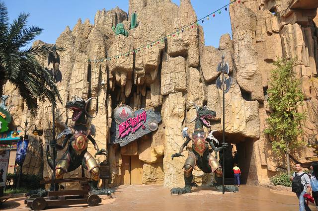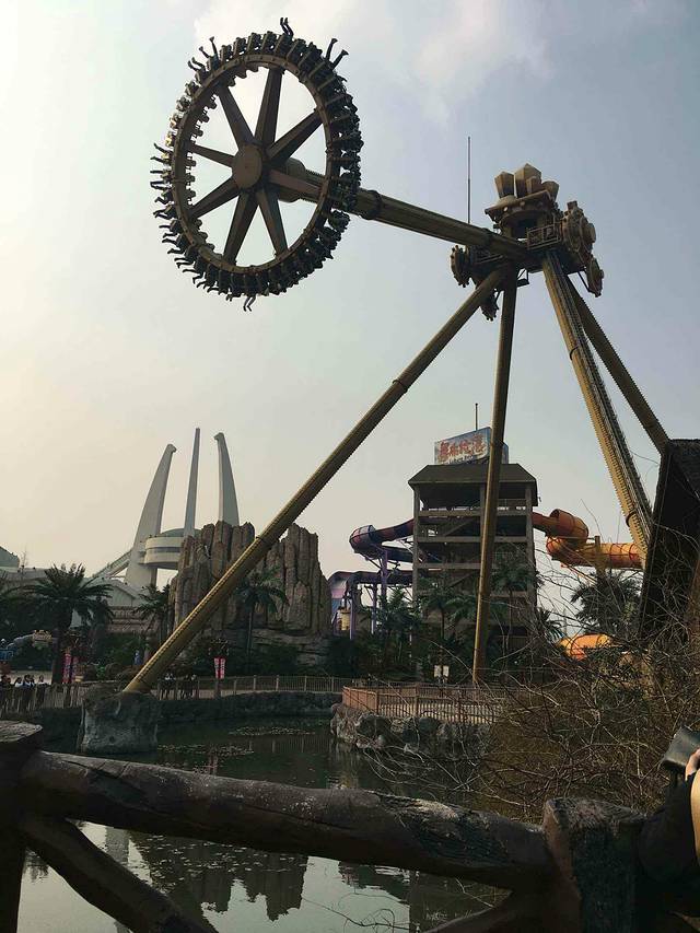 这个项目应该是我第一次来恐龙园就有的项目了,全程就像翻饼似的让整个人翻来翻去,朝观众的那面有火喷出,体验1分钟左右的时间,刺激程度3颗星,有一个13米的高空让你头往下,从下面的人看来会很可怕,从我看来就担心我不够胖,从座位上滑下来~。这个游戏一定不要再裤兜衣兜等没有拉链的情况下搁置物品,否则到高空的时候会哗啦啦的往下落,我第一次来玩的时候,那是相当壮观了,工作人员极为淡定的,用捕鱼网捞手机、捞钥匙,我们那会儿也是乐的。水火冲击项目结束之后我和朋友都有些累了,所以也就打算出去了。