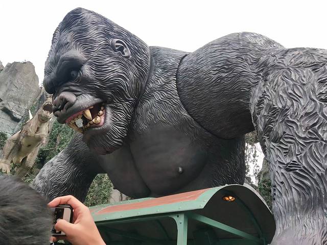 第二个项目,排队约15分钟,刺激程度1颗星。这个游戏我玩了3次(包括之前),可以说非常不怕了,这次有小学生一起玩的,我跟我朋友都是25岁左右的人~反而显得有些淡定,确实没有太大的惊吓,幅度也不会特别大,有升空,恐高的人可能会有些害怕。金刚会发出啊~啊~的声儿,小女孩比较害怕,会喷气之类,过程大约2分钟,每个人的座位前方有栏杆拉下来保护,另外有安全带的保护,稍微倾斜角度还是可以接受的哈!