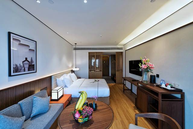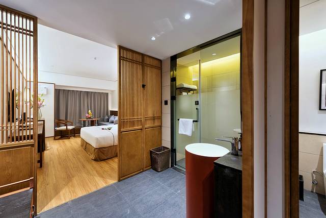 客房也是新中式的设计风格,推门的一刹那,雅致的新中式气息迎面而来:朴中带拙的胡桃木家具、黑白灰色调的挂画、蓝灰色的沙发、柚木色的地板、木栅屏风,再加上床头柜醒目的一抹橙红色,配色和谐、雅致又温暖。