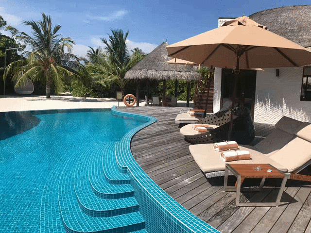 不一样的是家庭泳池别墅外有一个L形泳池,泳池上还有个小凉亭,同样几步路就能走出私人沙滩。还有特别的一点是二层有一个可俯瞰游泳池和海滩的露天平台。