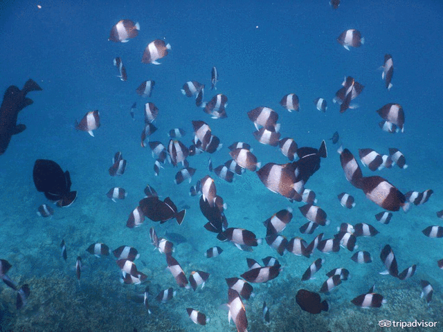 这里的公共海滩是绝佳的浮潜位置,因为小爱仅仅站在岸边就看到了很多正在游泳的鱼类,听说幸运的话还可以远远的看见海豚跃出海面呢,晚点借了浮潜工具就来这里浮潜试试吧。