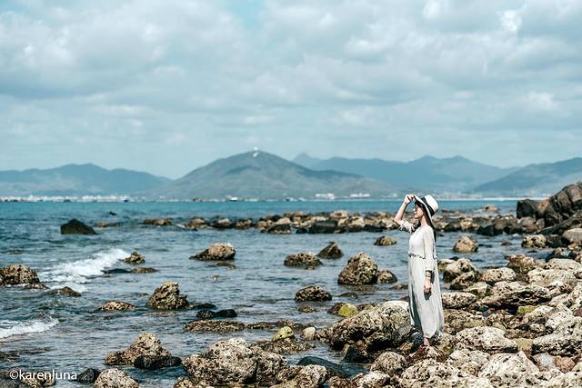 顺着往前走,终于在栈道尽头找到了一个可以下海的楼梯,一路下台阶,最终站在礁石上吹着海风,那壮阔的景象,真是不想拍出好看的照片都难呀!据说这里可是众多新人来这里拍婚纱照固定机位呢。