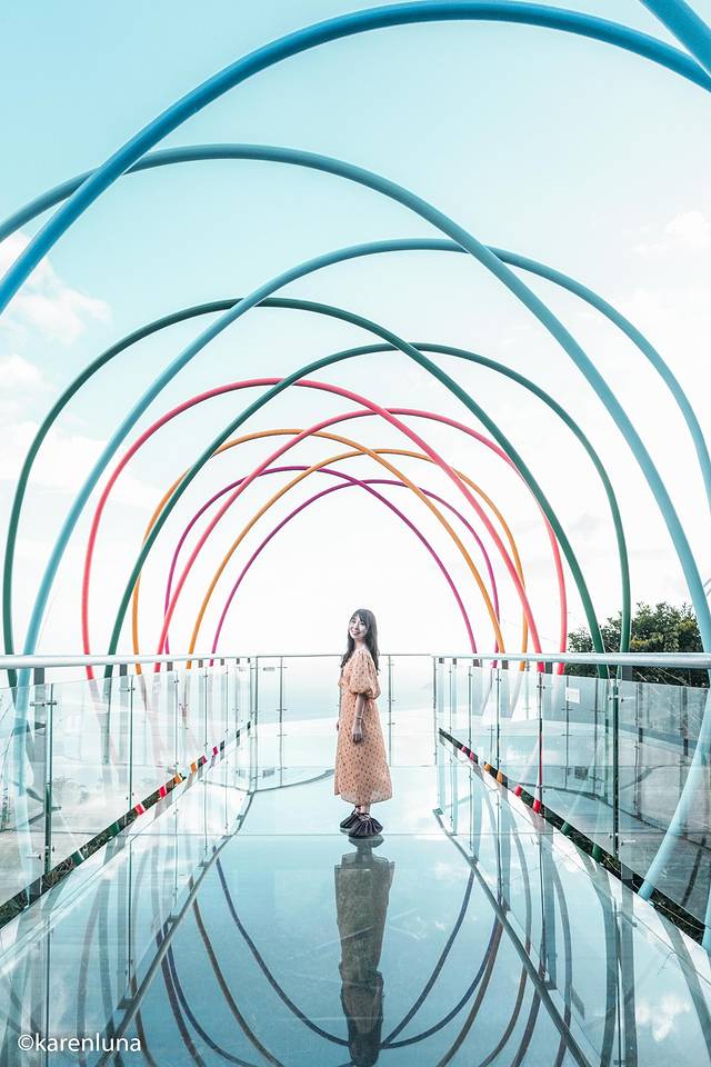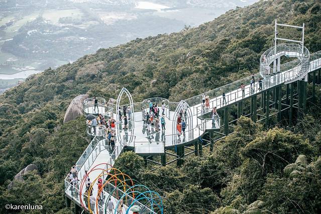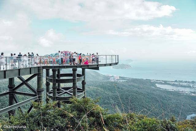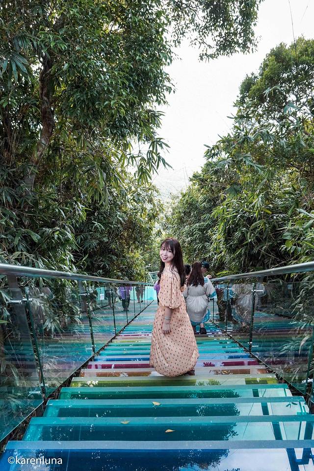 森林公园的玻璃栈桥其实是由很多个不同高度的观景平台所组成,海拔最高的地方有450米,全长400米,其中凌空台、七彩天体、采莲观景台、彩虹之路等等,都是很适合拍照打卡的平台。用景区官网上的一段话来形容简直是相当贴切啦:在栈桥上行走,既可以仰观天高云淡,也可以俯视逾百米深的雨林山谷,前可远瞰“天下第一海景”亚龙湾,胆战心惊之余,更可享受凌空而行的快乐。