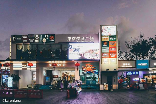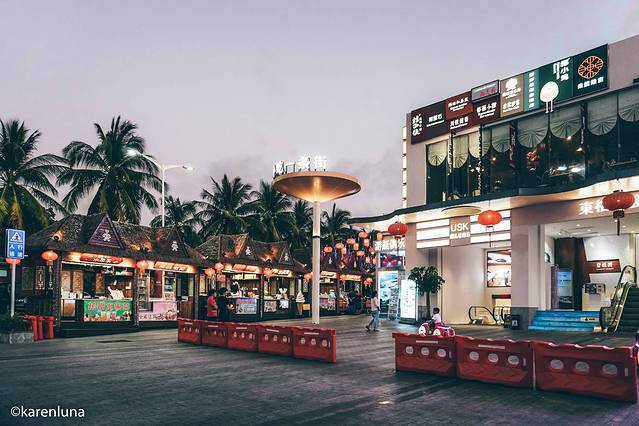 最先被吸引的便是广场一侧的小吃街了。什么海南椰子饭、热带水果茶,很多三亚小吃都能在这里找到,就连北京的糖葫芦、美味的关东煮之类的特色小吃这里居然也有,而整个小吃街上那一串串红灯笼,透着快春节的喜庆。要不是一天没好好吃饭,真想这里吃遍各地小吃。