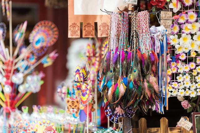 爱情街可谓是三亚千古情景区里的第一个主题街区了。头顶上颜色各异大小不一的花团随风飘摆着,跟两边的店铺招牌相衬着还算是喜庆。而细想起来,街道两边的店铺里所售卖的倒是都跟爱情相关。