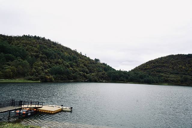 山顶的餐厅靠着水,玻璃窗下就是墨绿的湖泊。