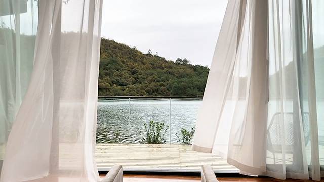 海景房,出了阳台就可以看到水平面,视野无限开阔,远方是环抱的山水。天冷有地暖,感觉被暖暖的环抱住。