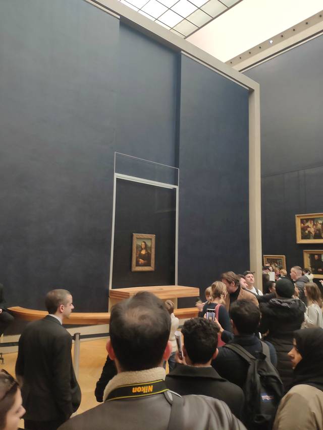 远眺蒙娜丽莎,没想到这幅画作这么小, 《蒙娜丽莎》是意大利文艺复兴时期画家列奥纳多·达·芬奇创作的油画。 该画作主要表现了女性的典雅和恬静的典型形象,塑造了资本主义上升时期一位城市有产阶级的妇女形象。