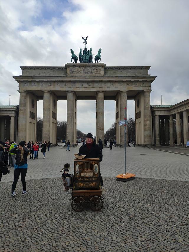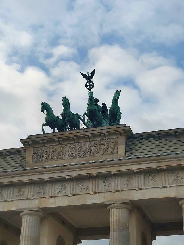 建于1789年的勃兰登堡门是柏林最重要的地标,这座4层楼高的希腊新古典主义式建筑,正反面各有6根大石柱支撑,两侧还有较矮的石柱长廊延伸出去,在城门之上矗立着一座胜利女神像,女神驾驶着一辆四马两轮战车,气势颇为宏伟。