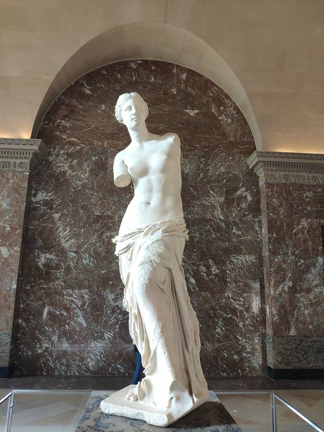 《米洛斯的维纳斯》(又称《米洛斯的阿芙洛蒂忒》、《断臂的维纳斯》)是古希腊雕刻家阿历山德罗斯于公元前150年左右创作的大理石雕塑,雕像表现出的爱神维纳斯身材端庄秀丽,肌肤丰腴,美丽的椭圆形面庞,希腊式挺直的鼻梁,平坦的前额和丰满的下巴,平静的面容,流露出希腊雕塑艺术鼎盛时期沿袭下来的思想化传统。她那微微扭转的姿势,使半裸的身体构成一个十分和谐而优美的螺旋形上升体态,富有音乐的韵律感,充满了巨大的艺术魅力