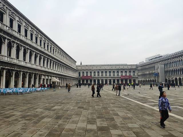 圣马可广场,一直是威尼斯的政治、宗教和传统节日的公共活动中心。圣马可广场是由公爵府、圣马可大教堂、圣马可钟楼、新、旧行政官邸大楼、连接两大楼的拿破仑翼大楼、圣马可大教堂的四角形钟楼和圣马可图书馆等建筑和威尼斯大运河所围成的长方形广场,长约170米,东边宽约80米,西侧宽约55 米。