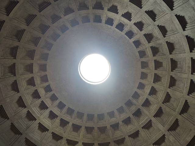 早在古代,万神殿就因其完美的比例而被誉为"罗马奇观"。时至今日,它仍是一个奇观:屹立不倒,这座神殿堪称圆屋顶的登峰造极之作,而圆屋顶正是罗马人最伟大的发明之一。在15世纪之前,它一直是世界上最大的圆屋顶,其高度和直径相等,构成一个完美的半球。罗马人是如何建造这个圆屋顶的呢?他们用浮石掺入混凝土,制成一种非常轻质耐用的建筑材料。这种特制的混凝土被浇注入壳体,自下而上渐渐变薄,圆屋顶的底部有22英尺厚,而顶部仅有2英尺厚。万神殿既是一座庙宇,又是一座皇家纪念物,始建于公元118年,与大角斗场和卡拉卡拉浴场共同代表了光辉灿烂的罗马建筑。它的主体呈圆形,顶上覆有直径达43.3米的巨大穹顶,这个跨度直到19世纪还无可匹敌。支撑穹顶的墙垣高度与穹顶半径大体相同,这种简单明确的几何关系使万神殿的单一空间显得格外完整,暗含宇宙的意味。穹顶正中有一个圆形大洞,直径8.9米,这是神殿惟一的采光来源,好像上天的眼睛发出的神圣光芒,营造出殿堂与神灵相通的神韵。神殿的圆顶和混凝土外壳结构在后来的基督教时代仍然被不断使用,这种穹顶成为欧美城市建筑艺术的基本形式,甚至改变了城市的轮廓线,影响极为深远。