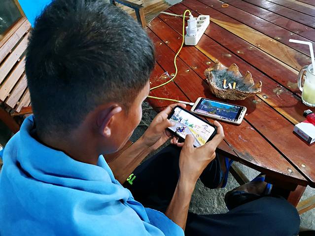 这是潜店的一个工作人员在玩和平精英,之前我们看到他一直在看和平精英的视频,但是自己手机上没有,通过简单的对话,我们大概能知道他们这个国家在不久之前应该禁止了这个游戏,从他的脸上,我们能够看出他对游戏的渴望。张哥将自己手机上的和平精英打开给他玩,我到现在还能记得他那开心的表情。他玩了一个小时,我们等了他一个小时。事后,无数次对我们说谢谢,想要加我们的脸书。