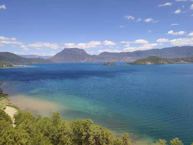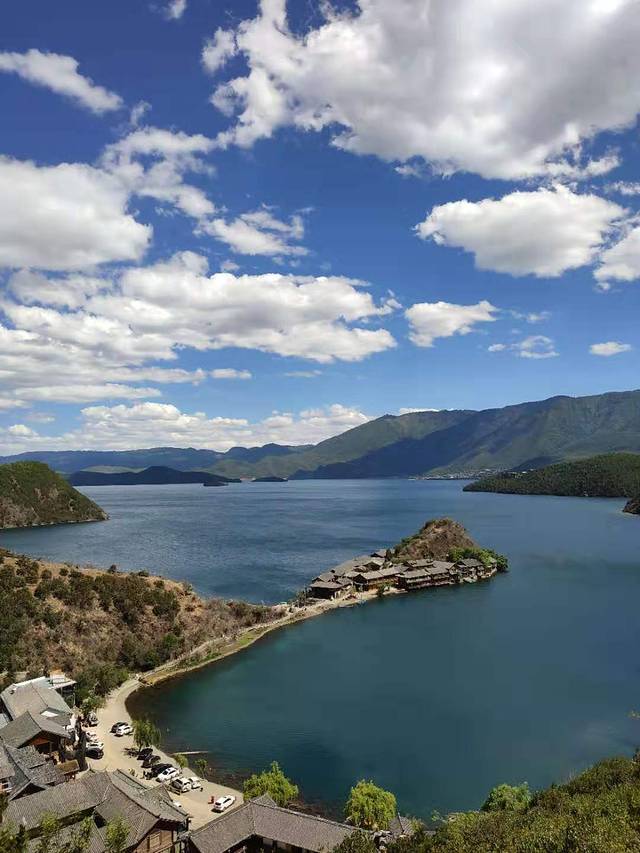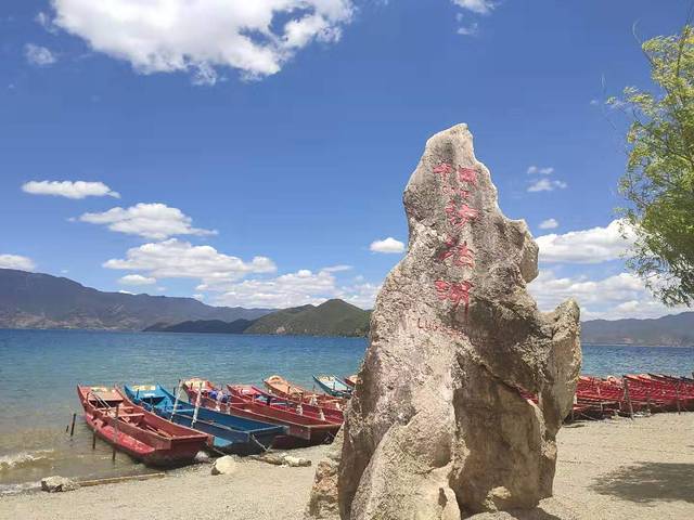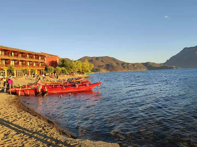 泸沽湖这个地方太美了,碧蓝的湖水映衬着碧蓝的天空,远处飘着雪白的云朵,感觉真是到了世外仙境。在车上司机大哥处报了个跟车绕湖游玩的团,还有一些其他的活动,晚上送我们到酒店处,第二天再带我们绕湖去到另一边,这样就绕湖一圈了,之后下午回丽江。价格不高,好像130左右。整体还不错。