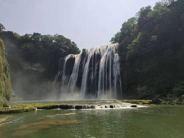 以下为黄果树大瀑布图片(注:大瀑布在我去完陡坡塘景区之后,又去了一次,第一次去天星桥景区机器扫描没扫出来,所以走的人行通道没检票,因此多了一次),顺着陡坡塘瀑布,走过一个石桥,是个商铺,这边人较少,然后顺着九九八一难那条路走,可以绕到大瀑布的后面去(不知道就问管理人员吧)。那边有一大片三角梅、房车营地、天主教堂、霞客亭等。从上面看大瀑布也很壮观美丽。如果票的次数不够的话,不能进去,不过远观也是很美的。