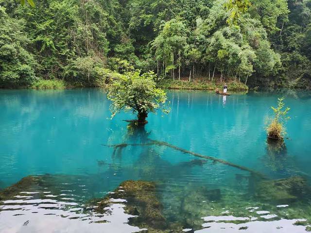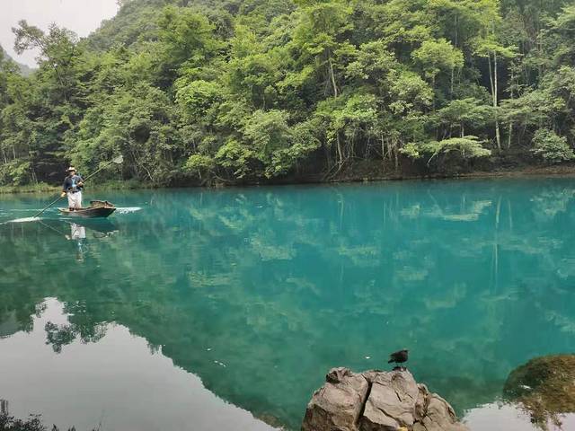 第一波进去,人比较少,这里的水真是震撼到我了,怎么会有这么蓝如宝石的水。这时一只小鸟停留在我前方的石头上,一个大叔站在一首独木船上,戴着斗笠,撑着杆慢慢划过来,这种场景真是美如画,看的我如痴如醉。Amazing!