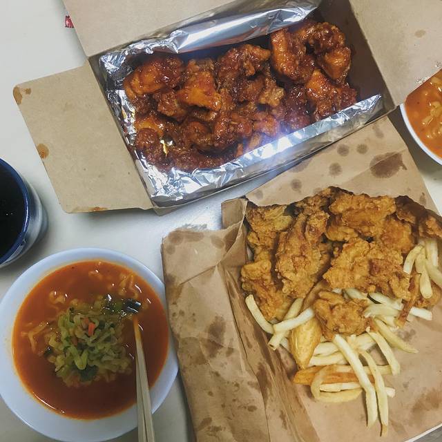 半只酱料鸡半只原味鸡好像也是17000韩元这样(多一点或者少一点) 哇也真的是好吃呜呜呜而且比第一家的份量多哈哈哈哈 还送了薯条哈哈哈哈 但是原味鸡没有第一家外卖的好吃!!