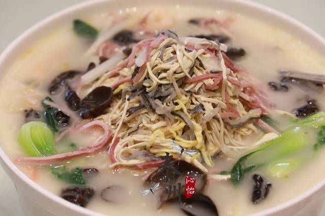 三宝鱼汤面是早茶的压轴,鱼汤面的汤顾名思义用小鲫鱼黄鳝骨文火慢炖数小时熬至浓稠奶白,下好的面条用漏勺捞少许到事先盛有鱼汤的碗中,洒一把青蒜花,扑上白胡椒粉,吃一筷面,喝一口汤,鲜香醇美立马秒杀味觉。