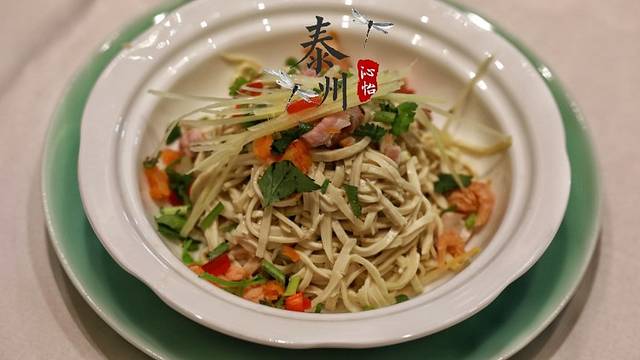 这天,是要从吃早茶开始打开水城“皮包水”慢生活方式的。泰州早茶有三宝:一宝烫干丝,有官方数据统计泰州一天的干丝食用量为三到四吨,可见泰州人和外地游客对干丝的喜爱。小小的一碟干丝,其实是道功夫菜,是用特制的刀由非遗传人“飘”成薄片,再切成粗细均匀的丝入碱水烫制而成,烫的时间是相当讲究的,多一秒变成浆水,少一秒则会发硬,烫好的干丝加上特制的佐料,便变成了老少皆宜的美食。
