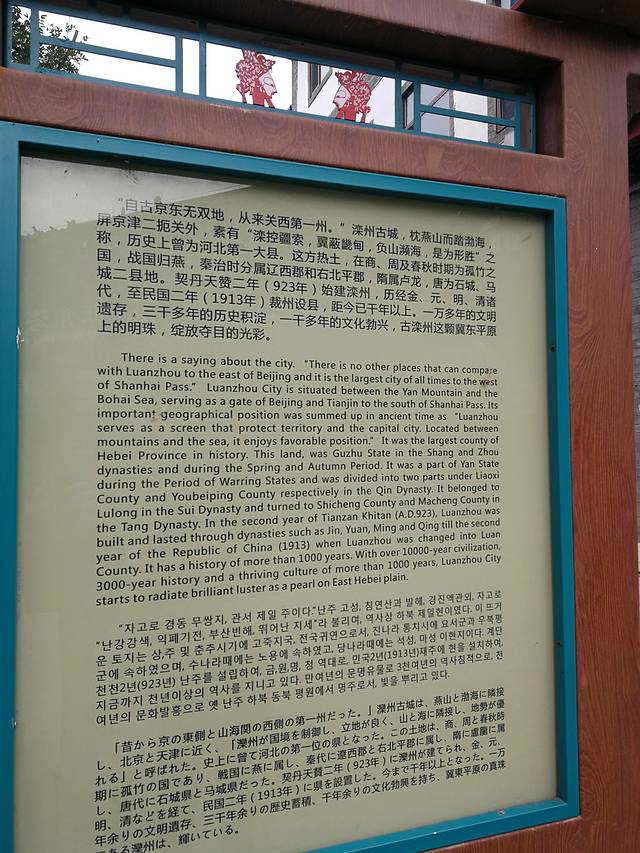 我们这次周末短途旅行,选择的是唐山。唐山著名的旅游景点有两个,一个是滦州古城,一个是唐山新开发的运河唐人街。滦州古城的兴旺发达是因为有一条穿城而过的母亲河——滦河。滦河发源于河北省承德市丰宁县的骆驼沟乡的小梁山。滦河流出大山后,先向西北流经坝上草原,称闪电河。它一路欢歌,奔向东南,流经隆化县、迁西县、迁安市、卢龙县、滦县、昌黎县、在乐亭县南兜网铺注入渤海。自古以来,生活在滦河流域的人类逐水而居、繁衍生息、创造了特色鲜明的地域文化。唐山的滦州古城就是滦河上一颗璀璨耀眼的明珠。运河唐人街则是唐山人新打造的一处国家5A级景区。