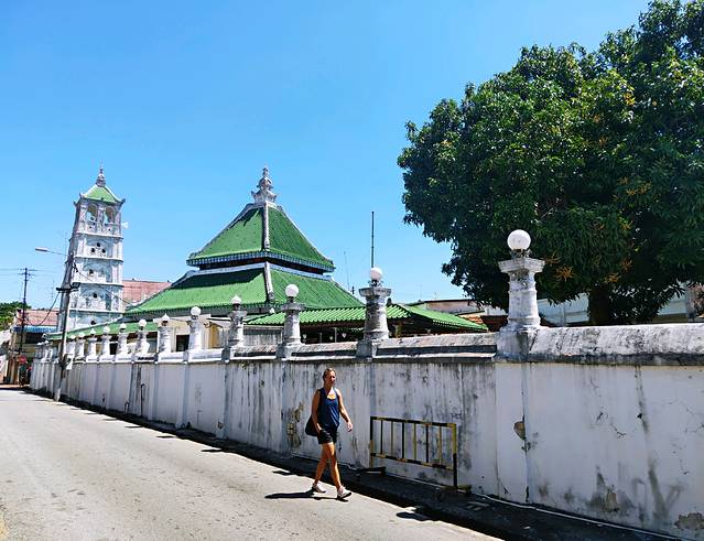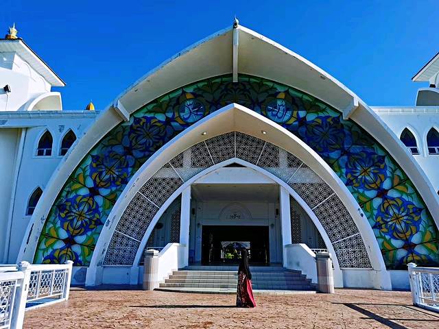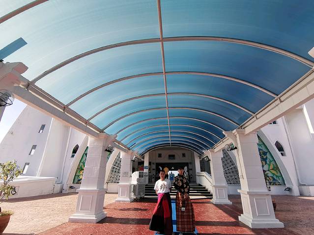 马六甲海峡清真寺,如果要进去的话,男生女生都需要换装。男生还好只是裤子换了,女生是全身上下包裹完哈哈。然后今天是内部不能进去,不能拍照,只能在边缘游览一圈。