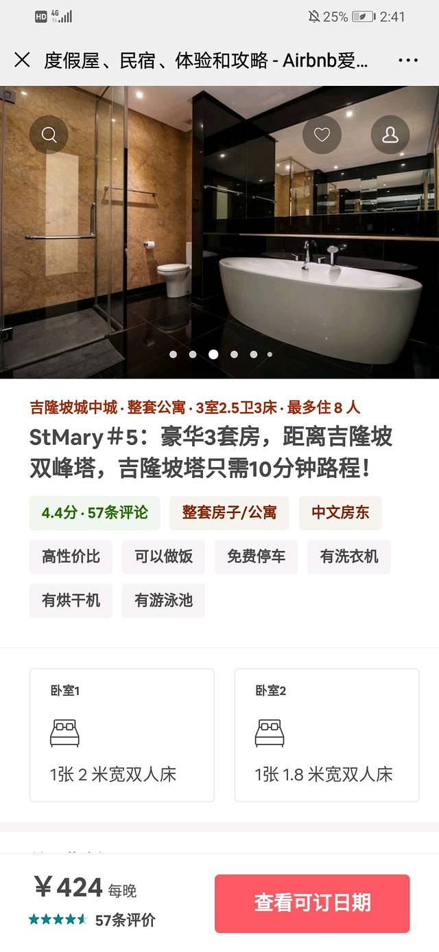 本来准备是住无际泳池的,名宿已经选好了,我们是在某宝上找的爱彼迎代定,可以打六折。但是换了四家无际泳池,全部都定不了。最后只能定一个普通的民宿,虽然没有武器泳池,但是其他各方面条件都很不错。位于市中心,地铁口,离双子塔和单塔都很近。