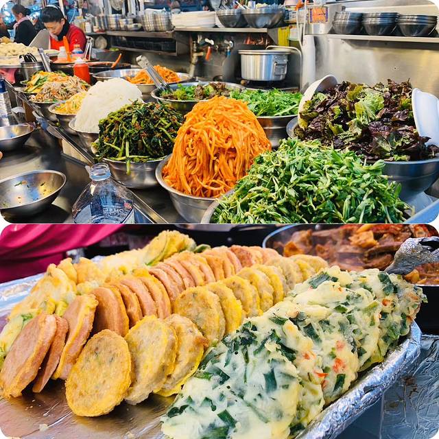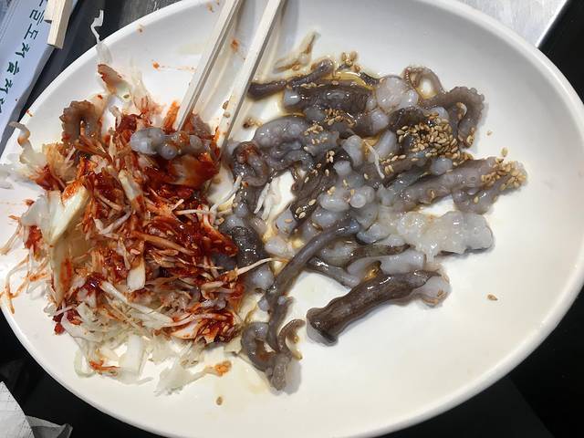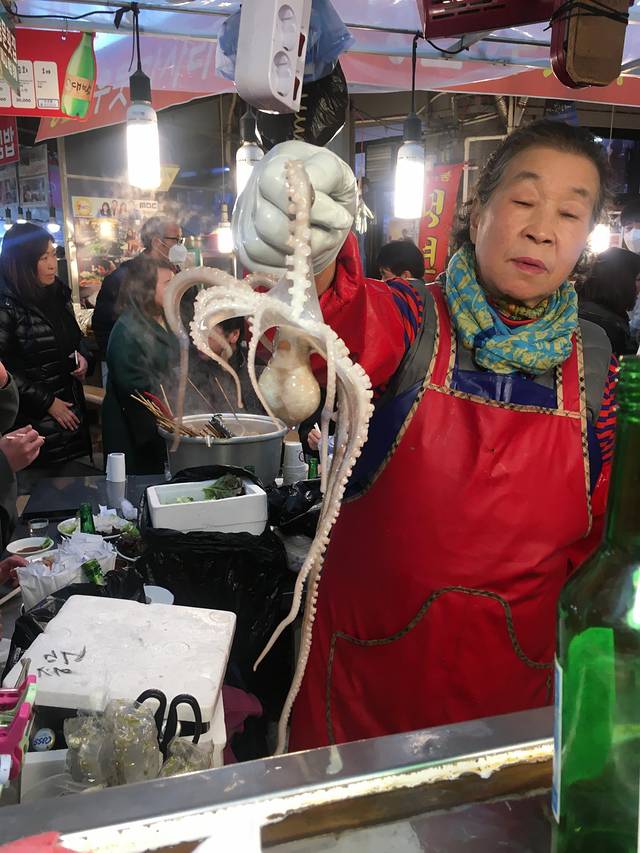 在广藏市场的生拌牛肉店,坐右边的韩国情侣给我们翻译菜单,坐左边的两个韩国老爷爷主动给我们一块绿豆煎饼,都超级nice。