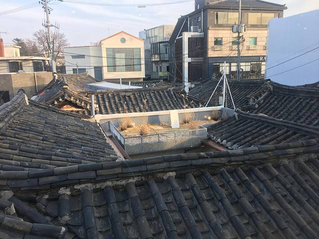 咖啡店的巨大落地窗正对着韩屋的院子。