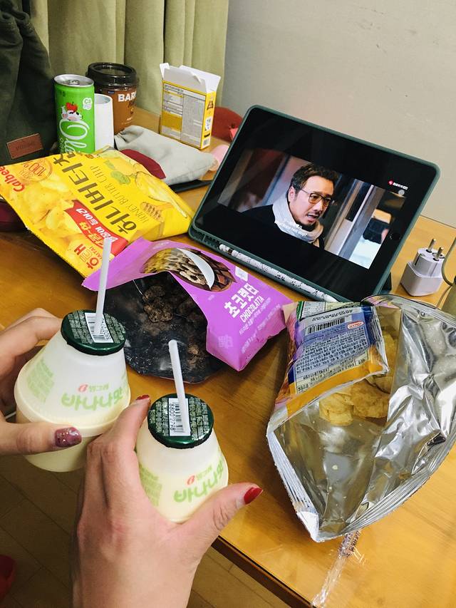 除夕夜四点才睡的我们,自己都怀疑自己哪来的旺盛精力。这些零食可是我们光着脚穿着拖鞋裹着羽绒服半夜三更跑到楼下便利店临时买的!一看温度,零下二度,我俩够拼!