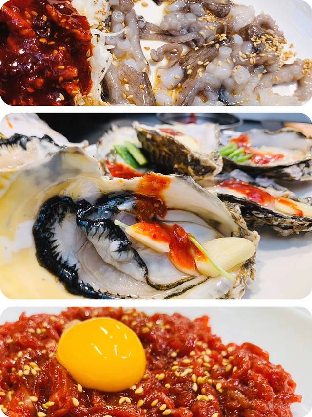 生蚝是在西班牙的时候雯心怂恿我吃的,浇了柠檬汁的生蚝很新鲜。韩国吃生蚝是蘸韩式酱的。生拌牛肉配上饭,也很好吃。