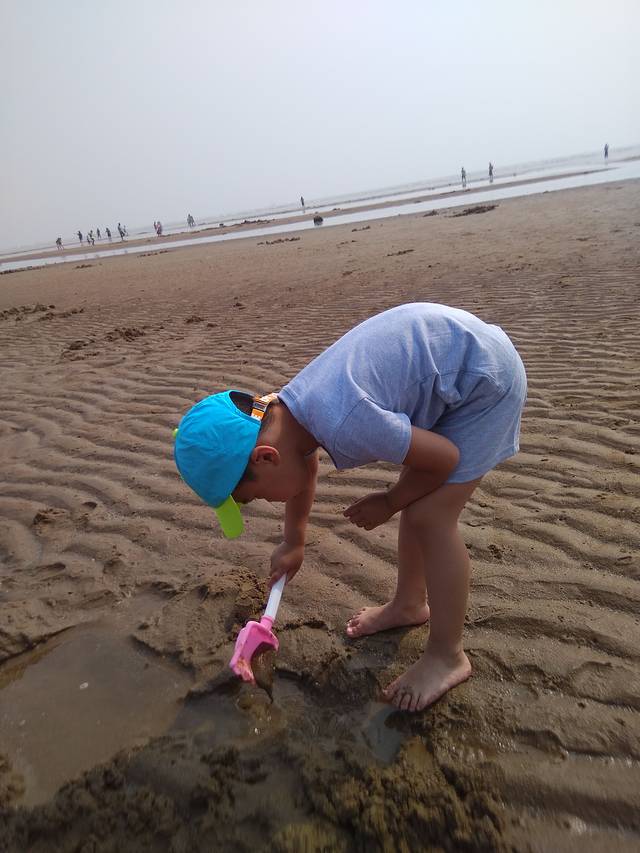 来到海边但期望中的小螃蟹一个也没挖到,不过小朋友就是挖挖挖,没螃蟹挖沙子也一样!今天的天气异常闷热,挖够了沙子公园随意逛逛,然后打车KFC吃饭,吃饱喝得回去午睡!