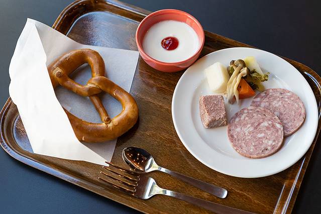 将本地名店的美式盐腌牛肉与自制泡菜、德国面包组套的“Morikine(森鸥外纪念馆)拼盘”550日元