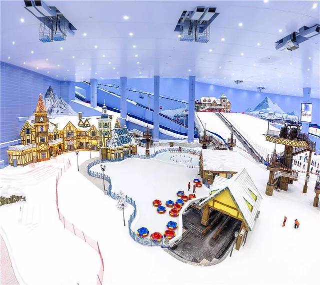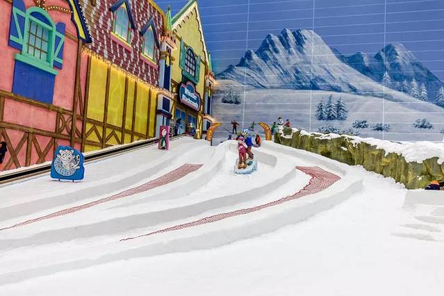 我仔细看了看,这里雪和我们常见的“碎冰式”人造雪不同,这里的人造雪非常细腻,很真实,我拿着我们导游派的娱雪卡把冰雪娱乐区的项目都玩了一遍,飞跃冰川、探险步道、雪上飞碟、冰上碰碰车、冰上自行车+七彩冰世界。