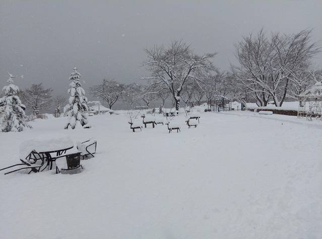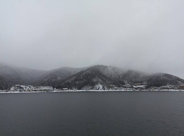 早上起来依然下着大雪,积雪很厚。走15分钟左右就到了河口湖,整个户外除了我之外没有其他任何游客,还好河口湖边有个咖啡厅开着,我进去早饭和午饭一起解决了。过了10点以后开始有游客了,但是比较稀少,我就沿着河口湖走了大半圈,由于积雪太厚,我穿的登山鞋全部湿透了。本来是去看富士山的,结果下大雪,能见度非常低,根本看不到富士山,一开始我以为河口湖是在富士山脚下跟富士山连着的,实际上不是,河口湖与富士山之间有很多村落,距离较远,河口湖就是靠近富士山的一个单独的小湖,与富士山没有连着。但是在河口湖是可以清晰的看见富士山的,在晴天。河口湖周围都被群山环绕。中午回到旅社,由于鞋全部湿透了。下午就没有出去了,在旅社把鞋烘干。