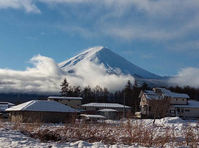 早上起来,阳光明媚,万里晴空,在旅社就可以看见富士山山顶。总算没白来一趟,还是看见富士山了,赶紧出门朝着富士山一路走去,由于道路上积雪融化,变得泥泞而且雪水横流,看着富士山就在眼前,走了半个多小时,发现要是从河口湖步行到富士山脚下,没有大半天肯定到不了。不过,总算可以清晰地看见大雪过后的富士山整个山顶,云彩纷呈,气雾变换,甚是壮观。约了10点钟的从旅馆去河口湖火车站的出租车,拍了一些照片就往旅馆赶了。其实,有些遗憾。要不是我后面的行程已经提前制定好了,包括订好的住宿,我会到富士山去。那天上午到了河口湖火车站,我发现有旅游巴士线路到富士山-高山(白川乡)等地,要是我没有提前制定好后面的行程,我会选择乘坐巴士去富士山游览一天,或者从富士山到高山,我后面的行程安排是先去名古屋再去高山。而且坐巴士票价还便宜很多,差不多比我坐火车便宜一半。考虑到如果临时改掉行程,后面的行程都得调整,所以那天还是忍着遗憾上午从河口湖坐火车去名古屋。