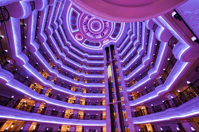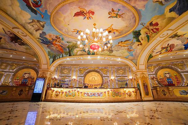 酒店在套娃景区附近,远看像一座公主城堡,本有的欧式建筑,让人初印象便很好。大厅的是圆形,富丽堂皇,和之前去过的烟台欧乐堡度假酒店一样,两者既有相似的地方,也有区别的地方。尤其是房间,房间虽然是标间,却也是欧式套房的风格,也很大。住在这里,可以当一回真正的小公主,或许是每个女孩子所向往的。