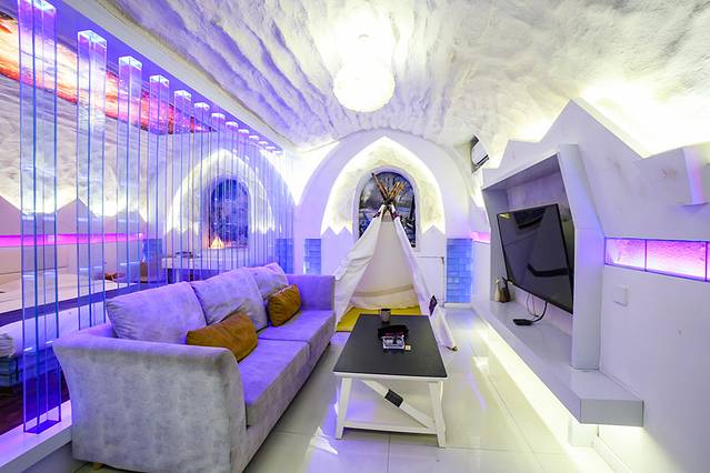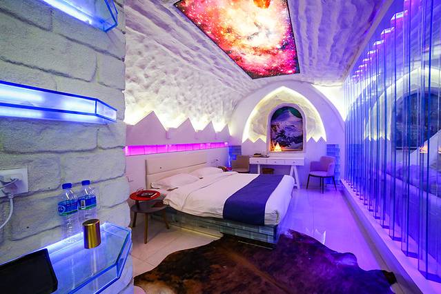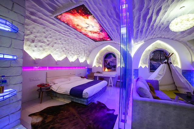 他家有冰窖酒店,整个屋里全是冰做成的,其实想想还蛮难的;另一个常规房间里的桌凳都是完全森林里大木的感觉,仿佛走进了原始森林,置入感很强。