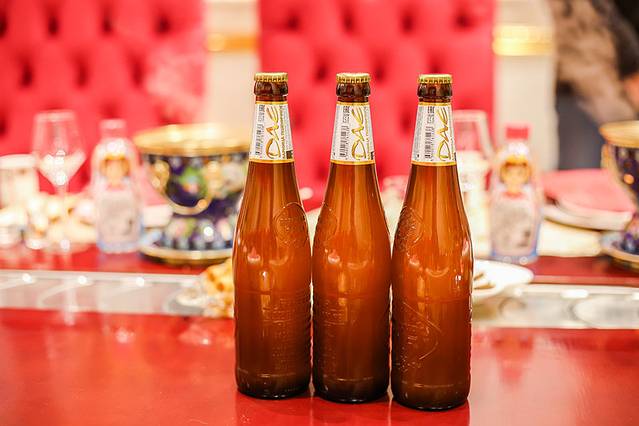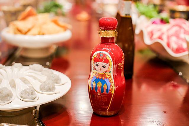 其次,火锅餐具都是套娃风格的,包括饮品、酒水以及矿泉水,都以套娃为形象做了相关产品。