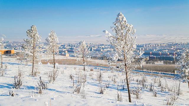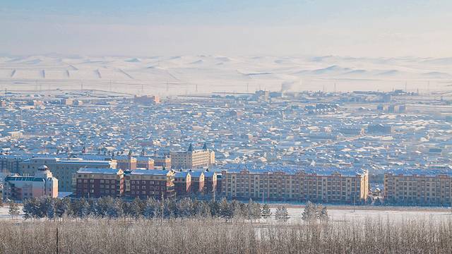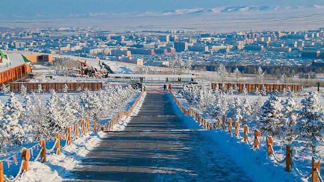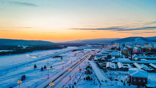 从最高处下山时,可看到额尔古纳市整齐并列的房子镶嵌在雪山下,宛若一处世外桃源,不禁让人觉得冬日里的美好抵不过如此。