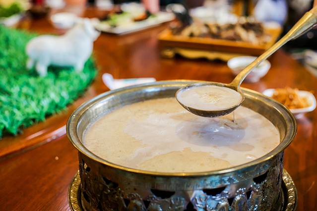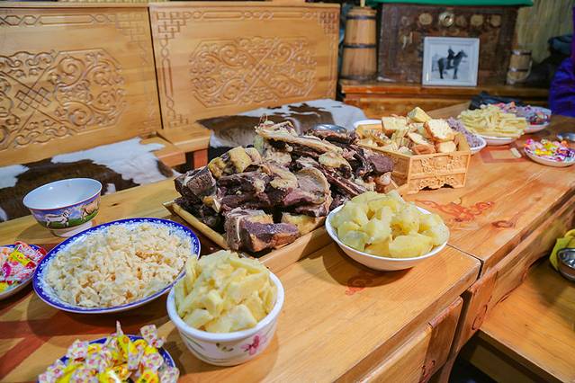 奶茶是蒙古民族传统的热饮,由砖茶水加鲜奶熬制成。喝时通常要加少许盐,也可以原味,也可以加黄油,泡炒米和奶制品食用,一天随时都可以喝,这里很多人家,早餐都会配以这个。在我们城市里大街小巷上见到的那些奶茶,绝大多数都是不健康的,但这里的不一样,未作太多的添加剂,比较纯粹。个人觉得原味很好喝,除了第一天,我每天都喝,还喝好几杯,有暖胃、解渴、充饥、助消化的功能。我们很多待客都是先上茶水,这里是地地道道的奶茶。