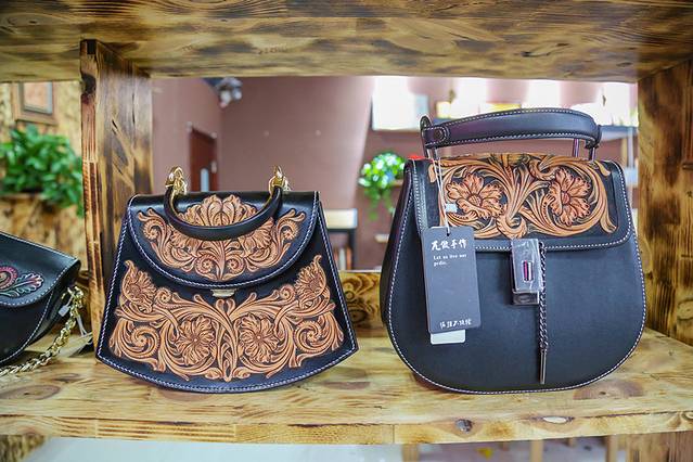 除了太阳花,还有鄂温克传统服饰、柳条包、五畜绳、皮雕等各种非遗传承人的店铺,都很吸引人,我自己买了一个羊皮的手机包(60元/个),也是很可爱的。