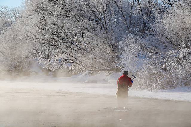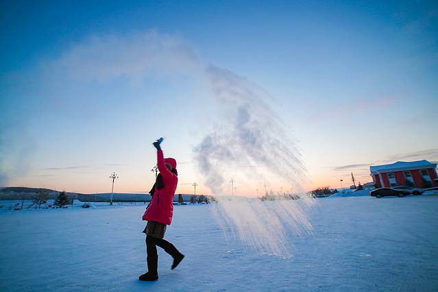 玩一次泼水成冰,在太阳初升或夕阳西下时,跳跃的把水杯中的热水抛洒出弧形,有技巧的把太阳圈在弧形中心,相机按下这个瞬间。